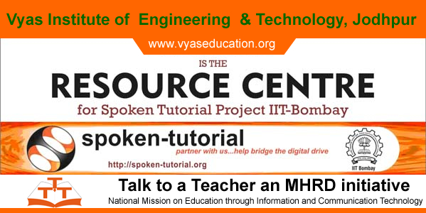 VYAS college OF ENGINEERING AND TECHNOLOGY (VCET) has been confirmed as RESOURCE (Robust Extensions for Spoken Tutorial project on Open Source Software Usage for Recruitment, Community and Education) Center for promoting the the "Talk to a Teacher" project of the National Mission on Education through Information and Communication Technology, launched by MHRD, Govt of India. It contributes towards IT literacy and awareness to become a RESOURCE Center. A RESOURCE Center can conduct remote SELF workshops in its college, for other colleges and can also train other colleges and schools in conducting Spoken Tutorial SELF workshops. It can identify SELF Workshop Organizers and Managers in schools and colleges, in its respective state. A RESOURCE Center can create a team of students and faculty members from the respective colleges to provide support to other schools and colleges for conducting SELF workshops. In this way, the project can be spread and awareness created in the entire state. for more details